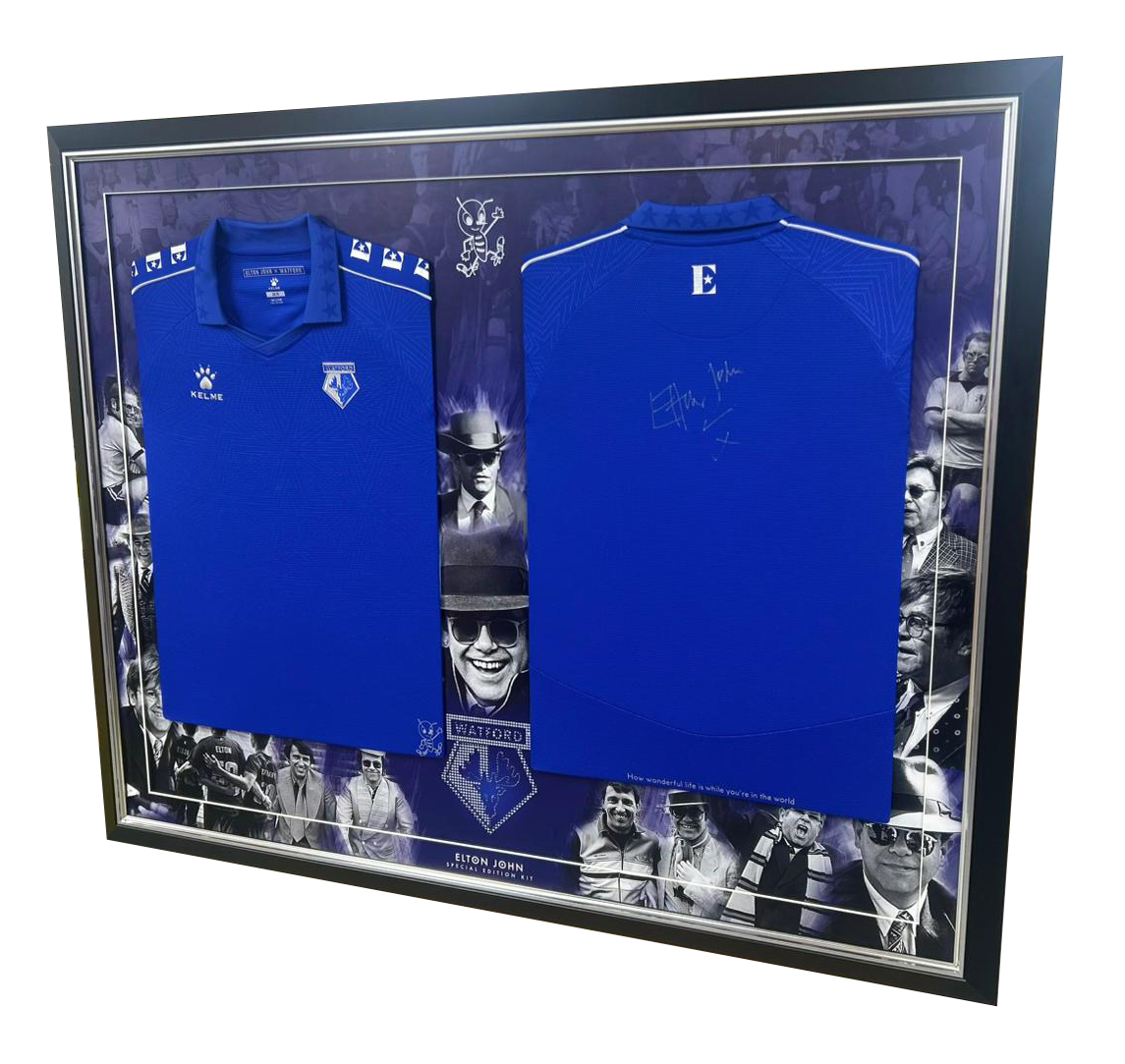The Hornets Shop is excited to offer you the chance to win at auction a one of a kind, double shirt montage frame signed by Elton John, this really is a unique item available to win.