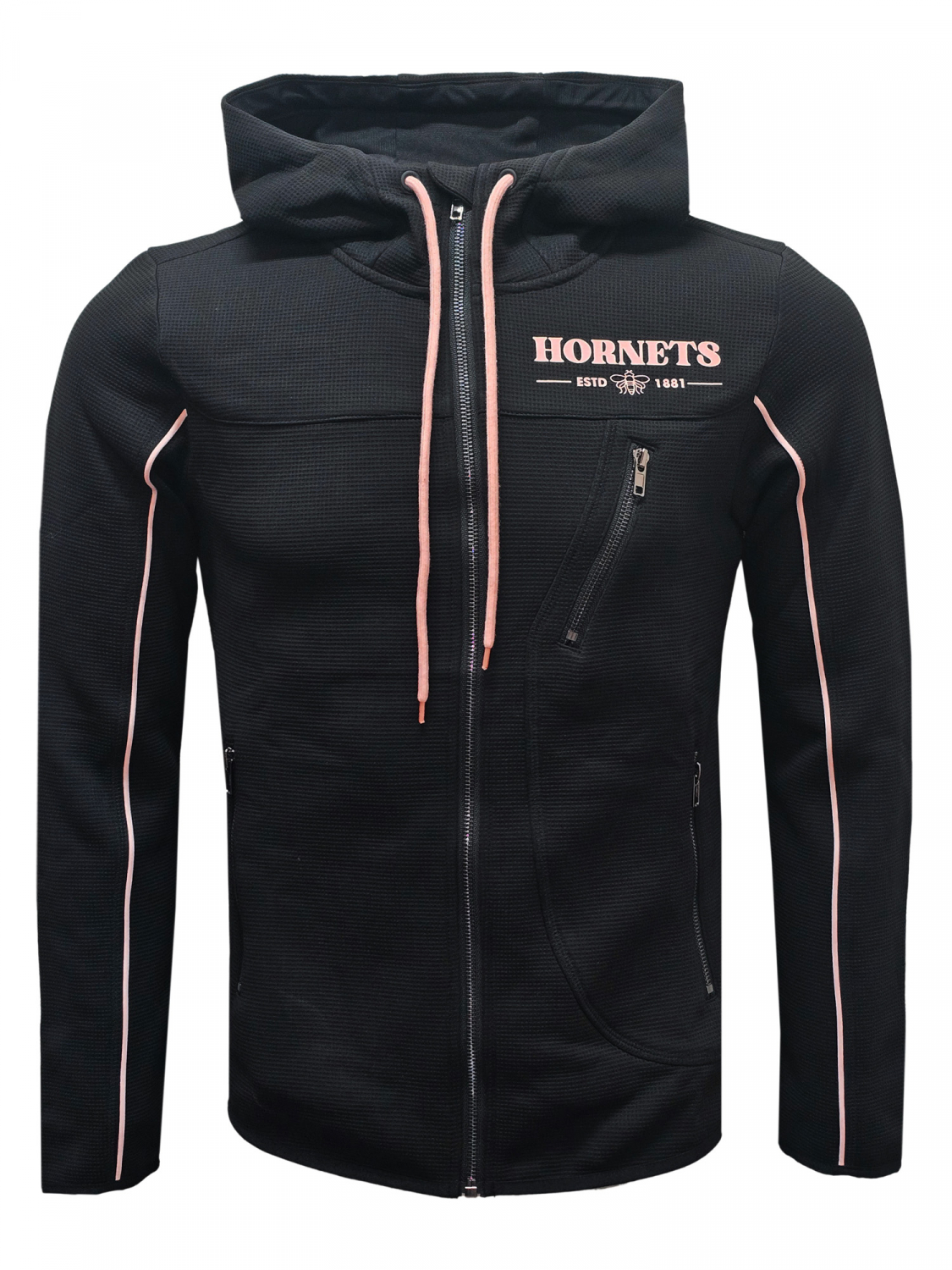 Show your Hornets pride in style with the Women's Logo Poly Jacket. This sleek zip-up features three handy front zip pockets including a breast pocket, finished with light pink piping and matching drawstrings for a bold yet feminine touch. Complete with Hornets lettering and logo in light pink, it’s the perfect jacket for comfort, function and Watford flair.