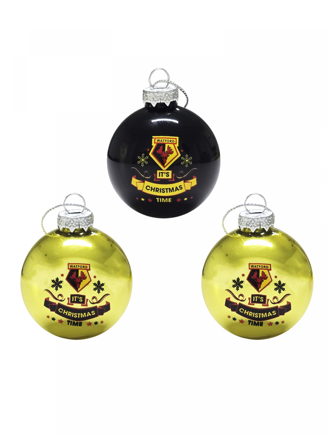 Bring some Hornets spirit to your tree with this festive 3 Pack Bauble Set! Featuring two gleaming gold baubles and one bold black design, each proudly displays the iconic Watford FC crest and the cheerful message 'It’s Christmas Time' Perfect for adding a touch of Vicarage Road magic to your holiday décor, because nothing says Christmas quite like Watford pride shining under the lights!
