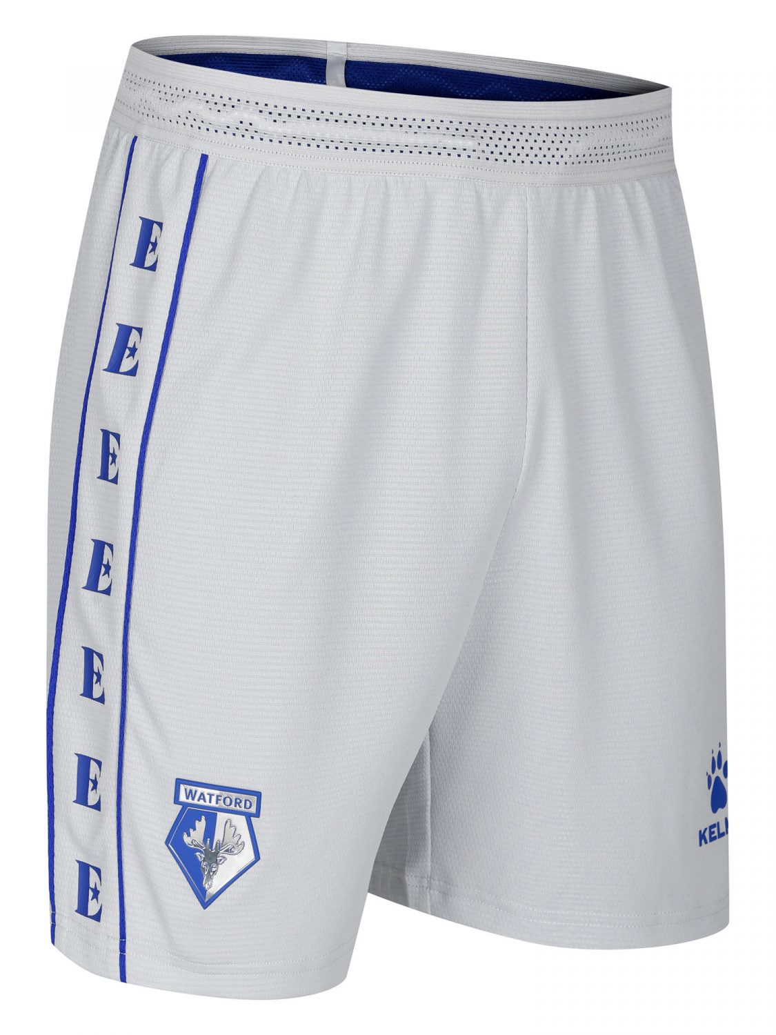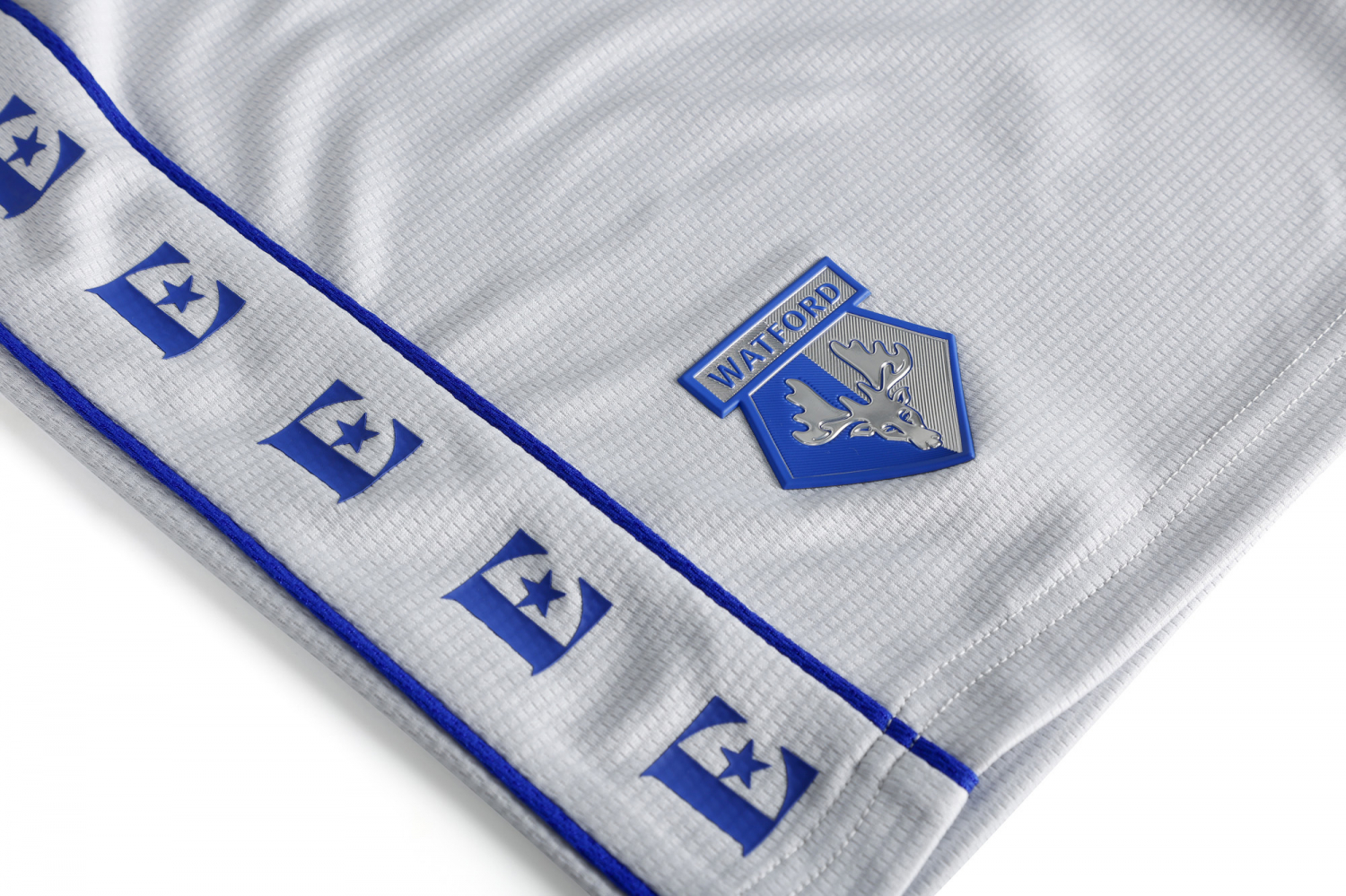 The shirt is made from a bespoke polyester knit with a star design sublimation. The Watford crest and Kelme logos are in contrasting silver and on the hem is the ‘Happy Hornet’ badge which was the club crest when Elton became Chairman.