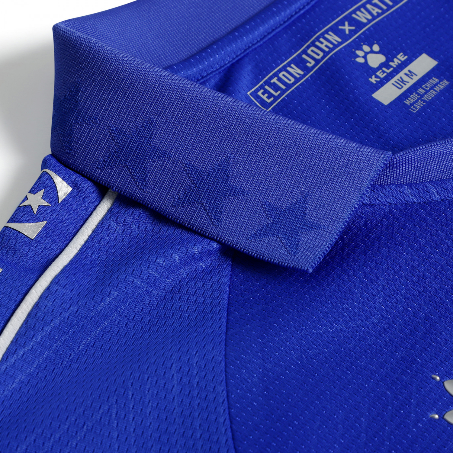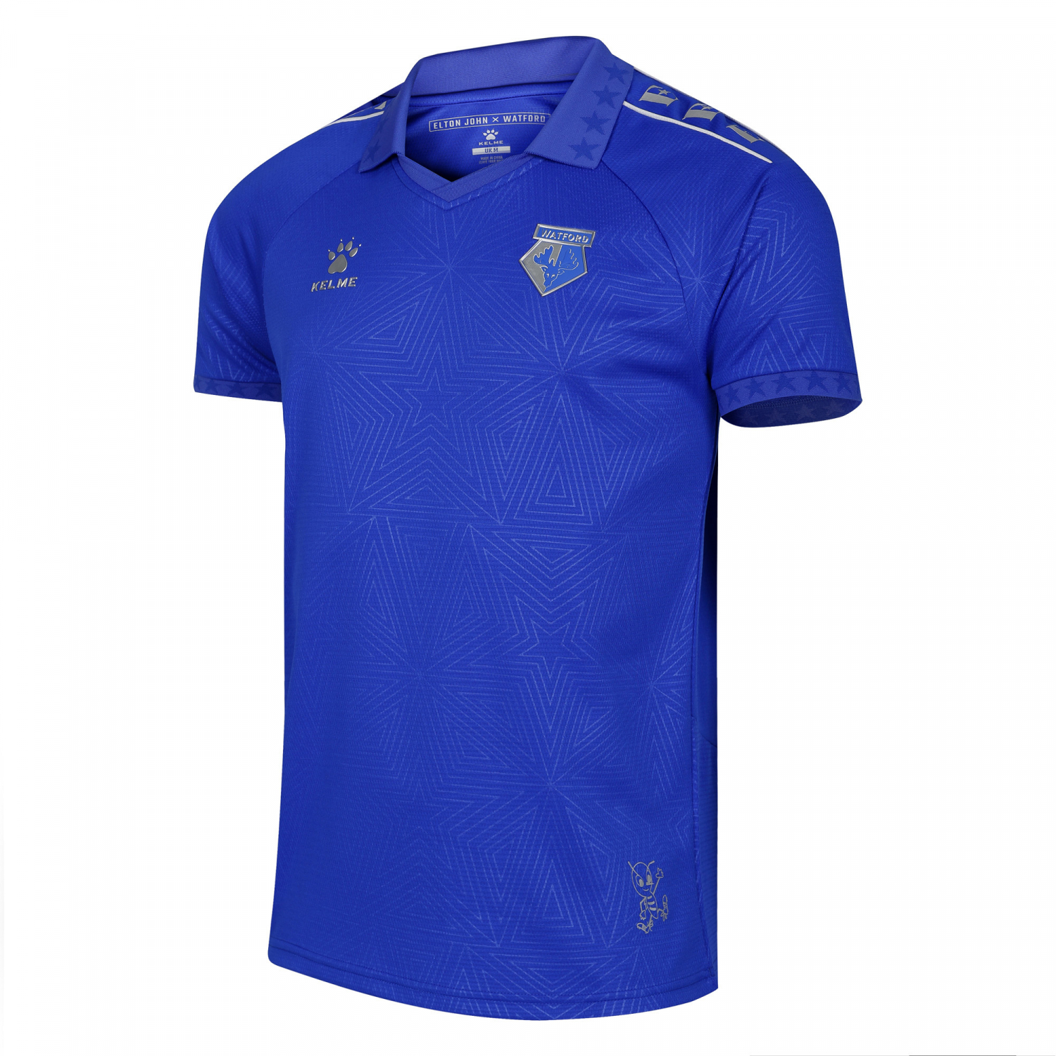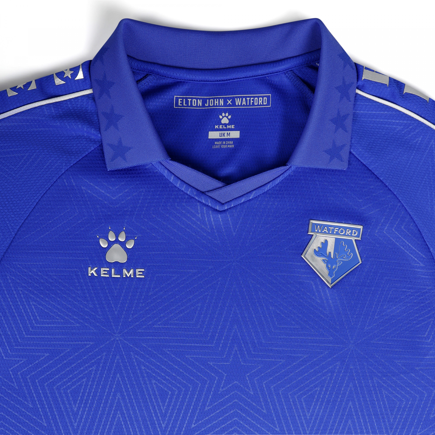 The shirt is made from a bespoke polyester knit with a star design sublimation. The Watford crest and Kelme logos are in contrasting silver and on the hem is the ‘Happy Hornet’ badge which was the club crest when Elton became Chairman.