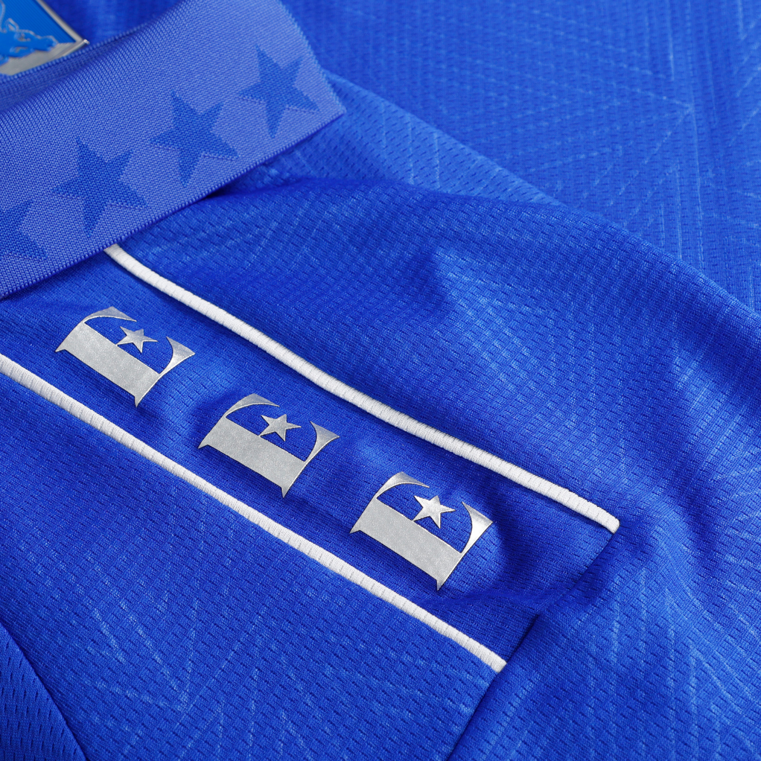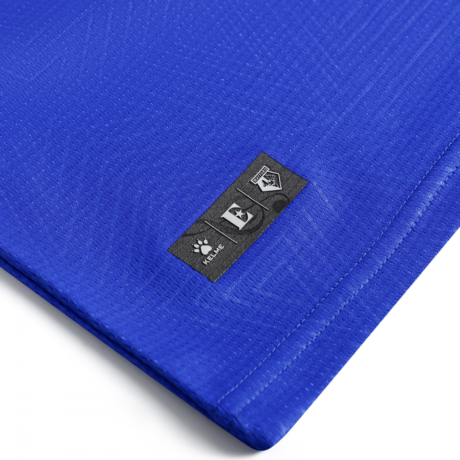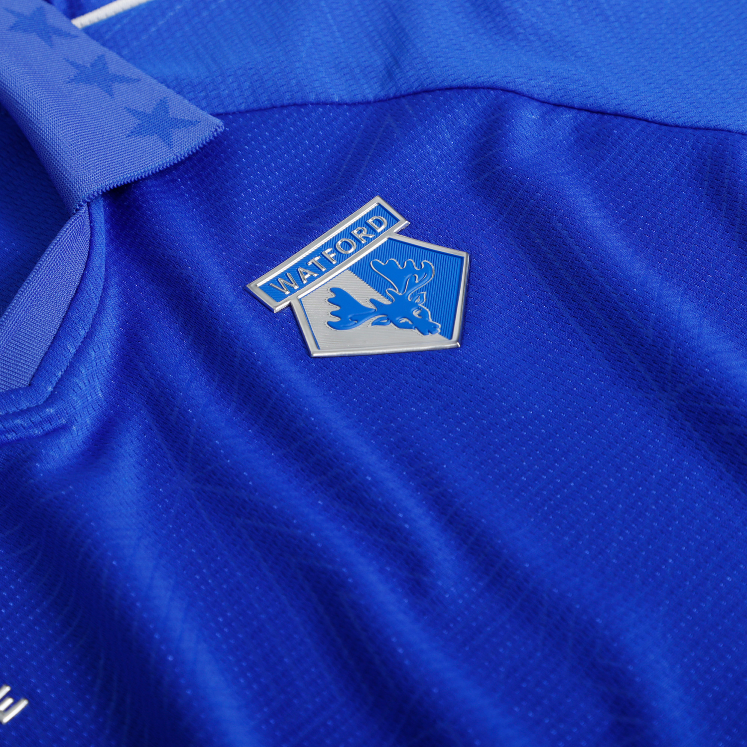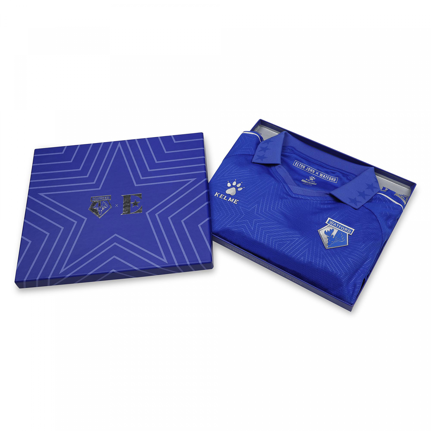 The shirt is made from a bespoke polyester knit with a star design sublimation. The Watford crest and Kelme logos are in contrasting silver and on the hem is the ‘Happy Hornet’ badge which was the club crest when Elton became Chairman.